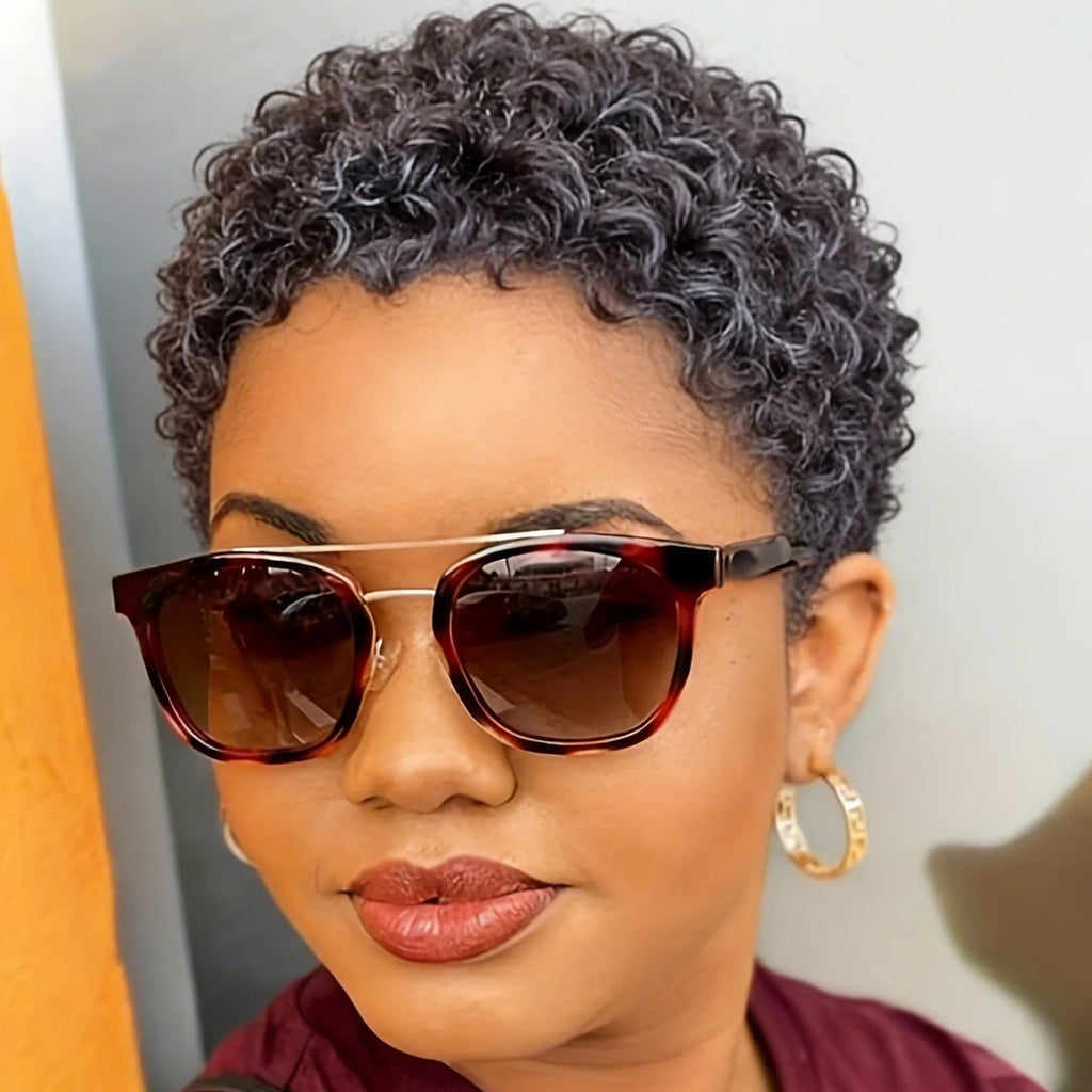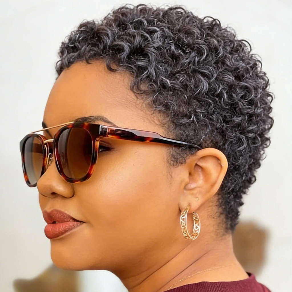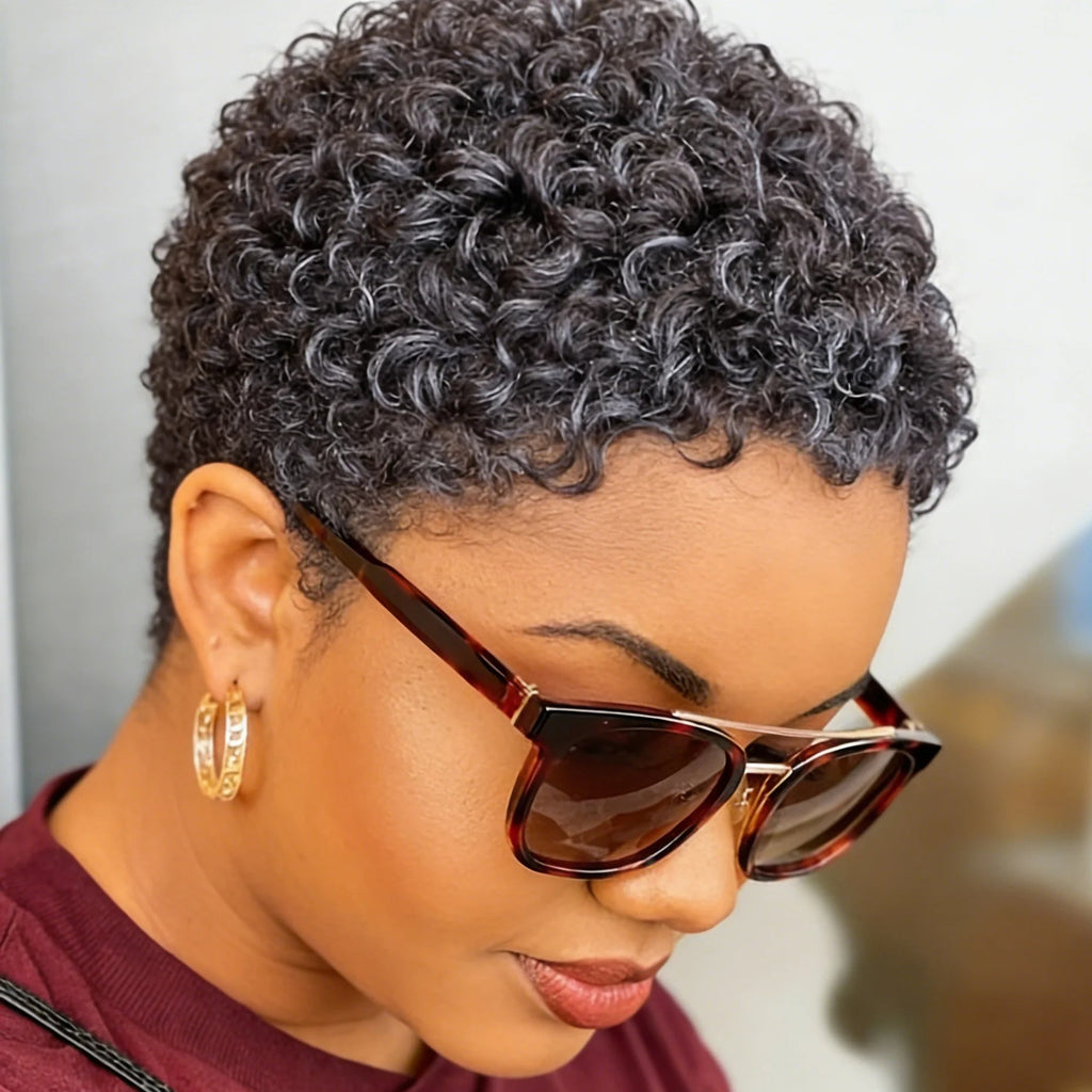 Cette perruque courte et bouclée, de style pixie, est confectionnée à 100 % en cheveux humains pour un rendu naturel et doux. Grâce à sa coupe dégradée et sa fabrication entièrement à la machine, elle offre un volume naturel et un confort optimal au quotidien.