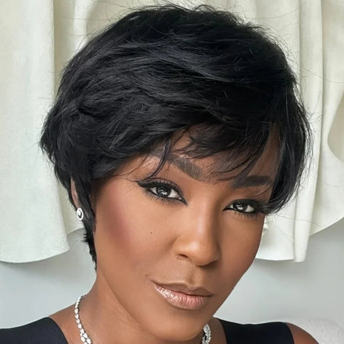 Cette perruque courte et lisse de 15 cm, de style pixie, est confectionnée à 100 % en cheveux humains Remy pour un fini doux et naturel. Avec une densité de 150 % et un confort léger, elle est idéale pour une élégance quotidienne ou une coiffure de soirée, dans un noir naturel classique.