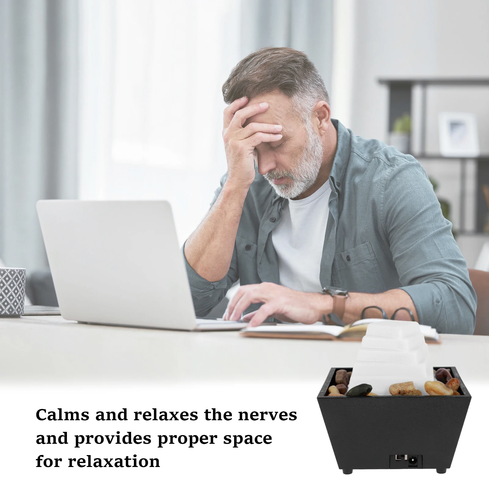 [Conception et décoration artistiques créatives] Nos décorations de fontaine de bureau combinent de l'eau courante, de l'éclairage, des galets et d'autres éléments, la différence de hauteur fait que l'eau courante émet un son de cascade unique, qui peut calmer et détendre ; la fonction d'éclairage unique a une réflexion douce ; les galets naturels assortis ajoutent une touche naturelle.