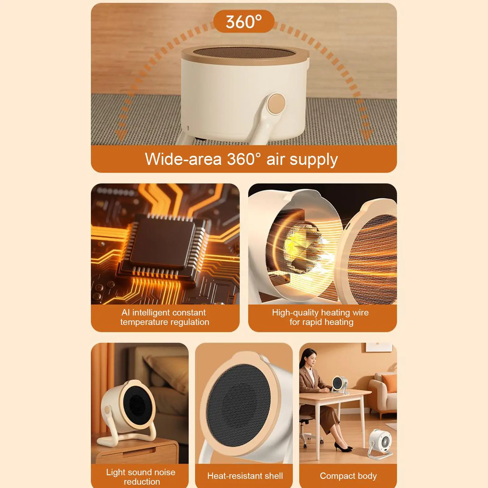 5. Tilpasningsevne for flere scener: Den lille romvarmeren har plug-and-play-funksjonalitet, noe som sikrer enkel drift i alle omgivelser. Den kompakte og allsidige designen gir enkel transport og tilpasningsdyktige varmeløsninger på tvers av forskjellige innendørsområder.