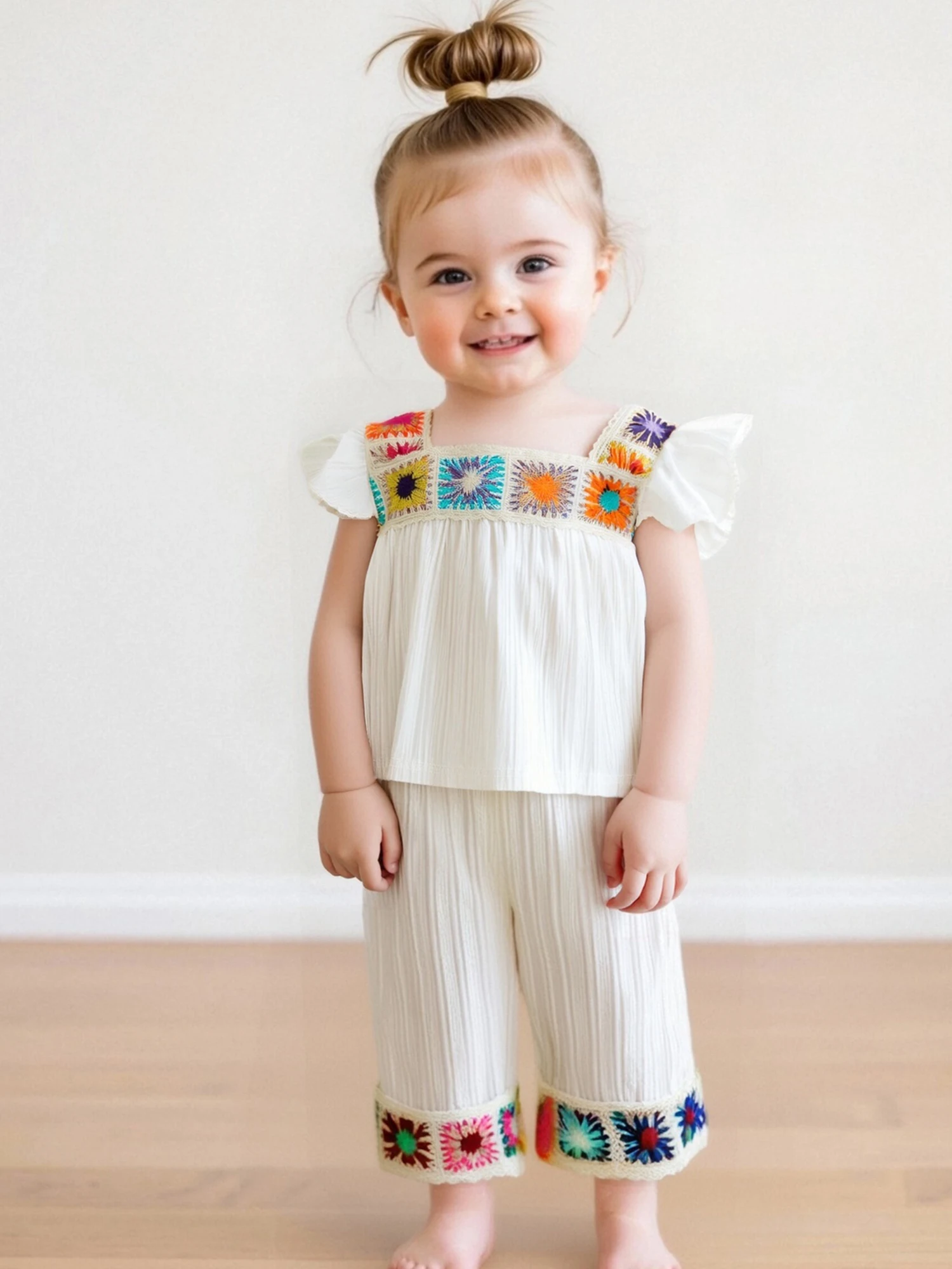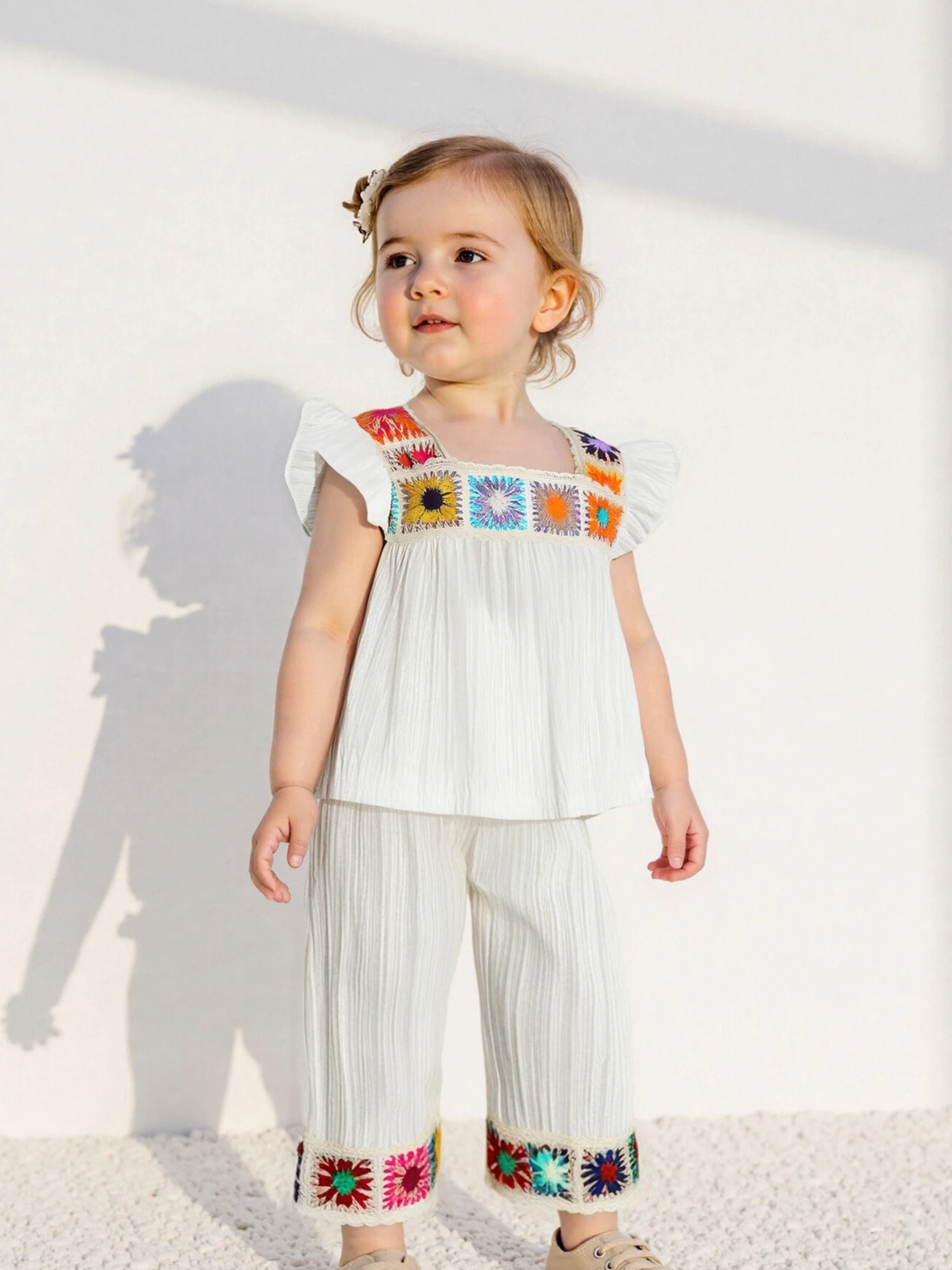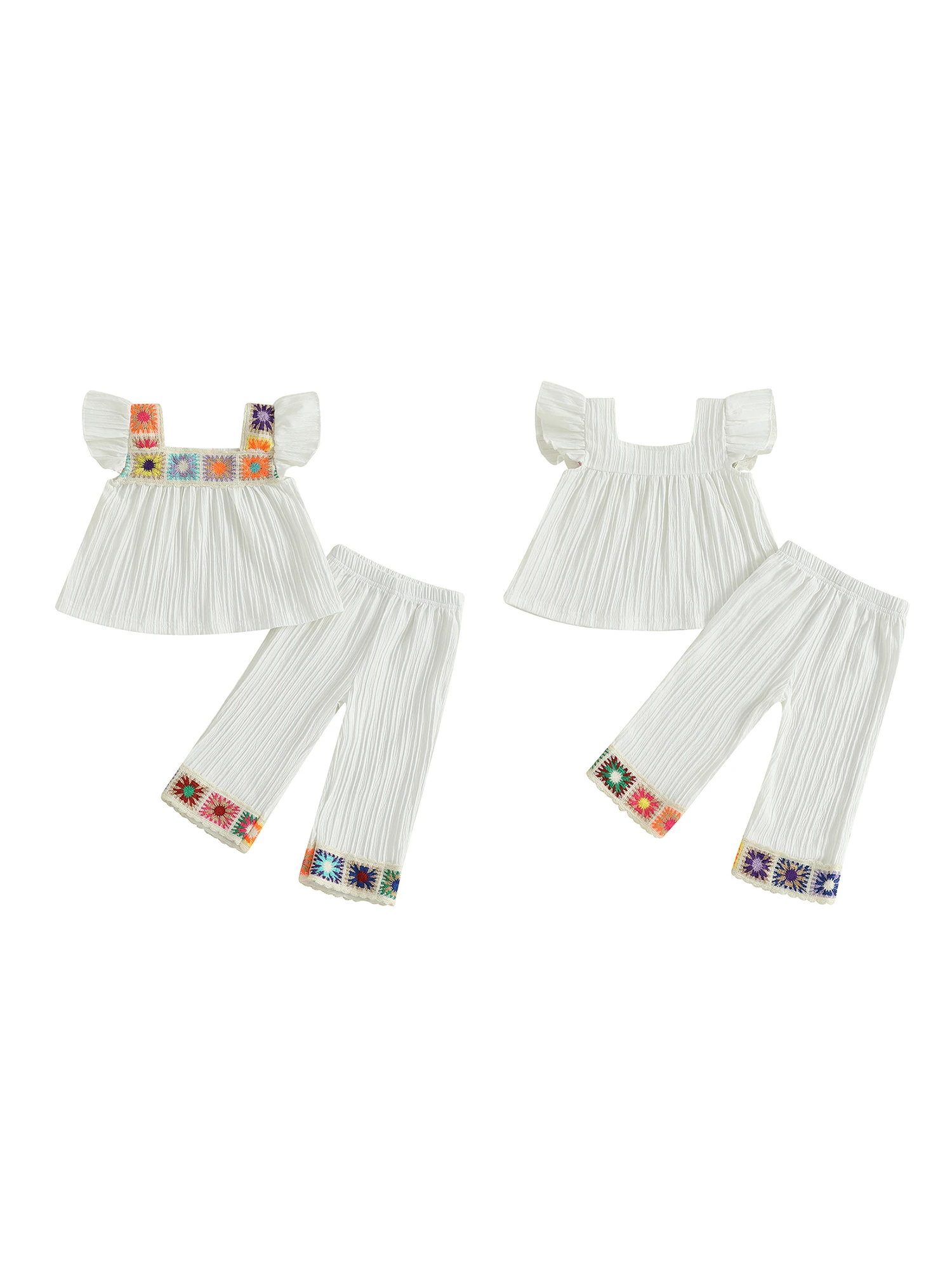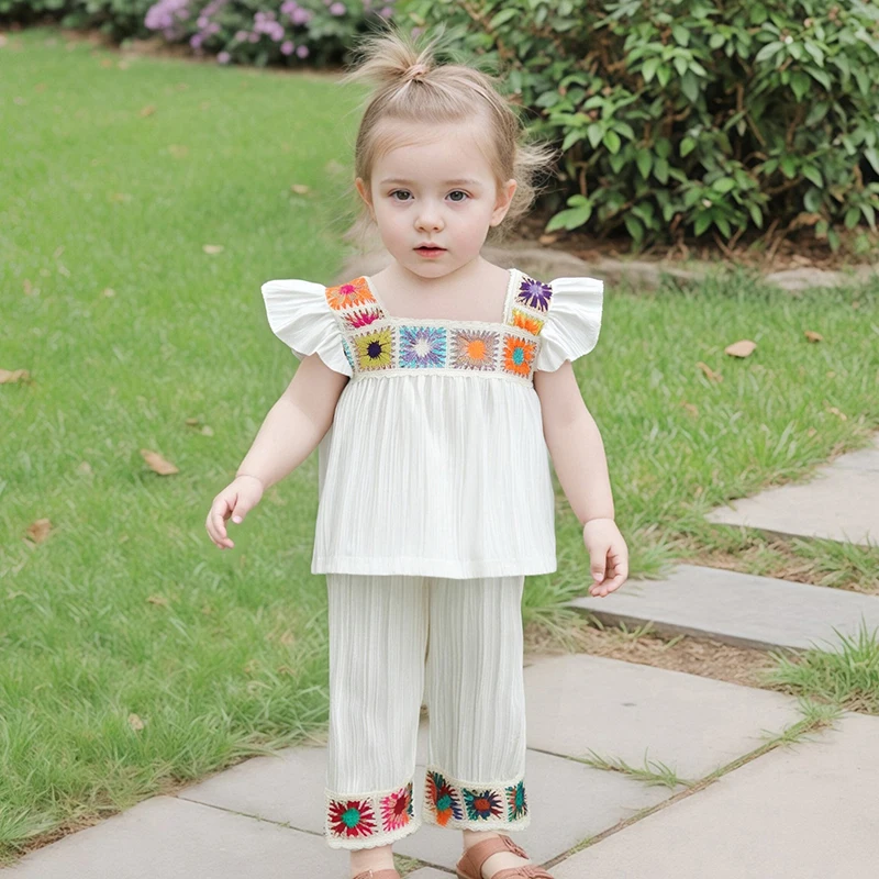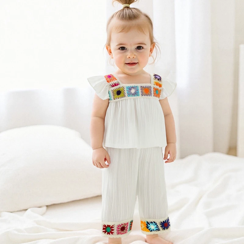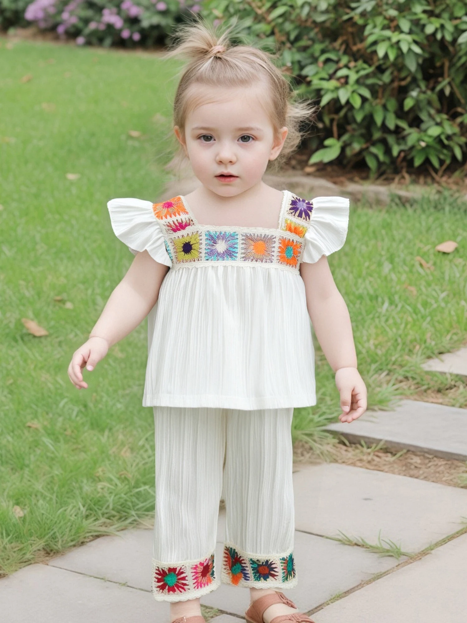 Babyjentebuksesett med heklet blomster, flygende ermer, babydoll-topp, elastisk midje, bukser, 2-delt sommerantrekkStørrelse (cm)
