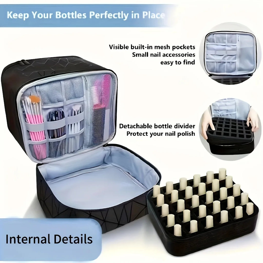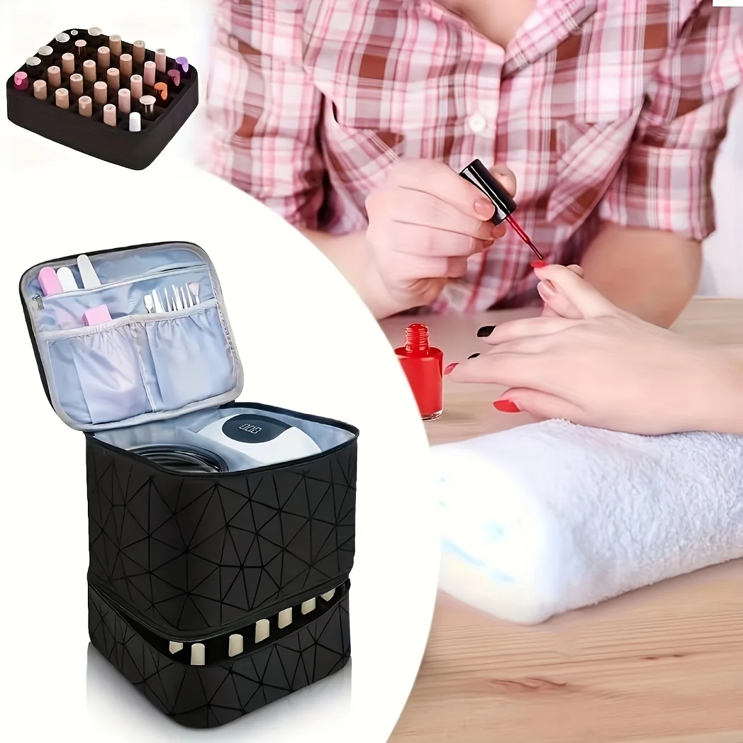 Med justerbare skillevegger holder den sikkert neglelakkflasker, verktøy og tilbehør, og inkluderer til og med et dedikert område som er kompatibelt med de fleste små neglefønere.