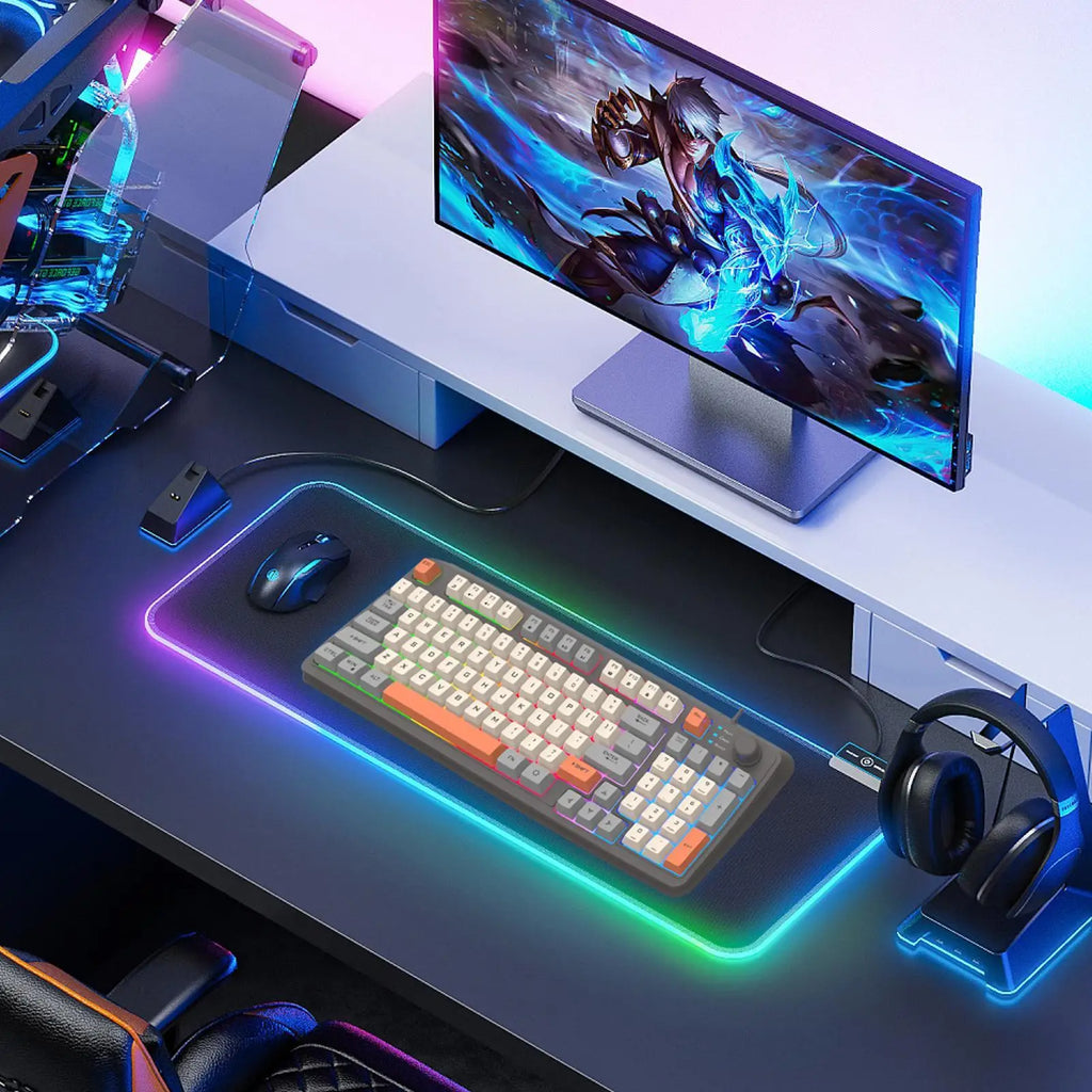 1. Effektiv skriving: Med taktil tilbakemelding og rask responstid lar det opplyste mekaniske spilltastaturet deg skrive komfortabelt og raskt, noe som forbedrer spill- og arbeidseffektiviteten din.2. Forbedre spillingen din med letthet: Takket være den ergonomiske skrivevinkelen på stigeformen, sikrer dette mekaniske tastaturet med 94 taster som fungerer samtidig og avansert anti-ghosting-teknologi en jevn og responsiv spillopplevelse.
