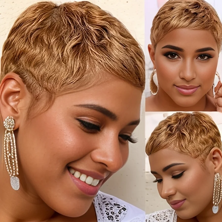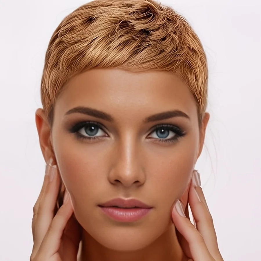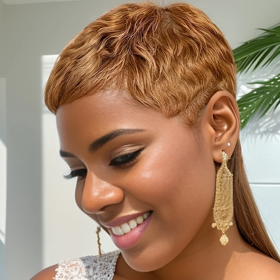 This 4-inch pixie cut wig features a beautiful blend of 27/30 warm brown tones with a curly wave texture and 150% density for a full, vibrant look. Made from 100% human hair with a comfortable full machine-made cap, it’s perfect for daily wear, outings, and party looks.