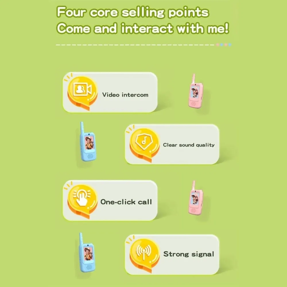 This 2-piece kids video walkie-talkie set features a high-definition screen and easy one-click calling for instant communication. With a built-in rechargeable battery, it’s perfect for playtime, family adventures, and safe fun indoors or outdoors.
