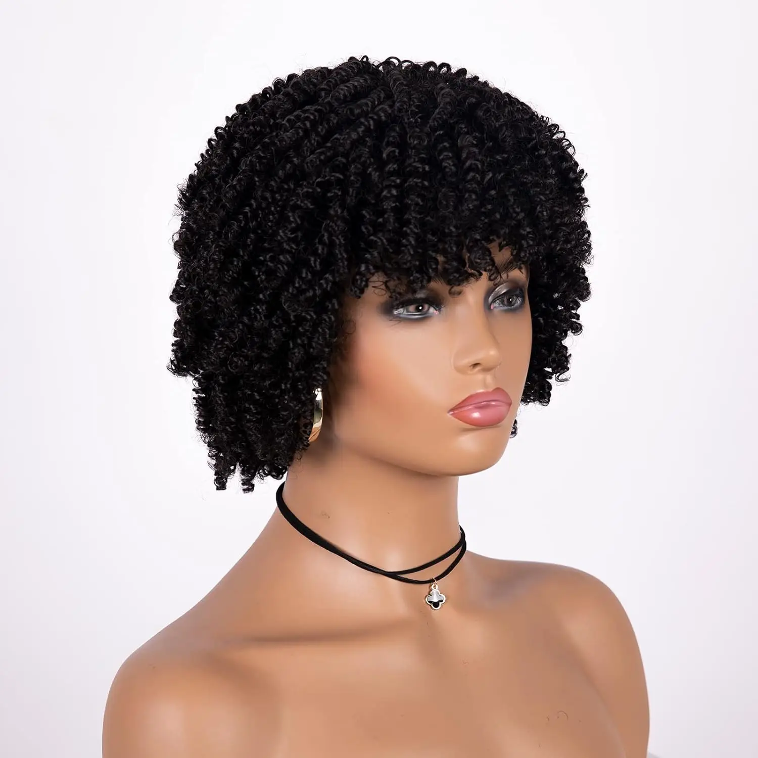 This short curly afro wig with bangs delivers a full, natural look with defined curls. Made from soft synthetic hair, it’s lightweight, comfortable, and perfect for daily wear, cosplay, or party styling.