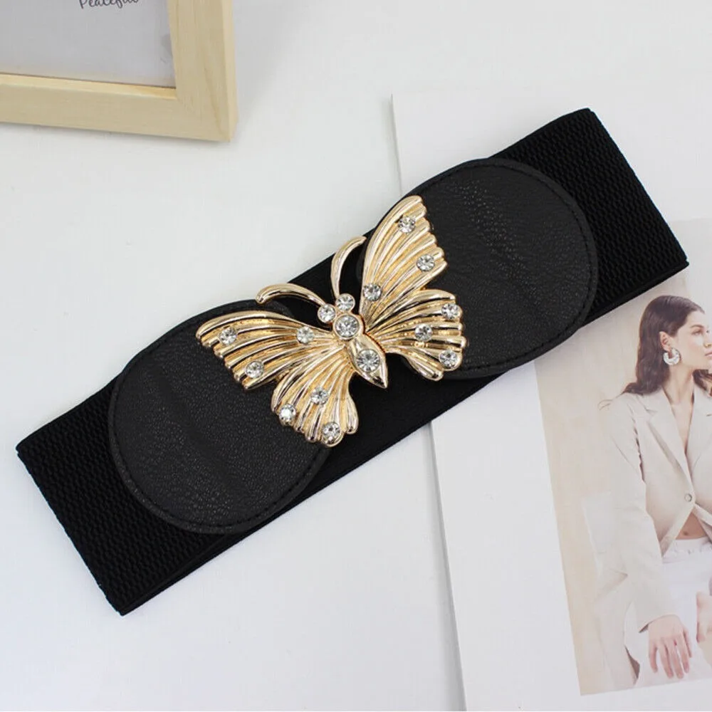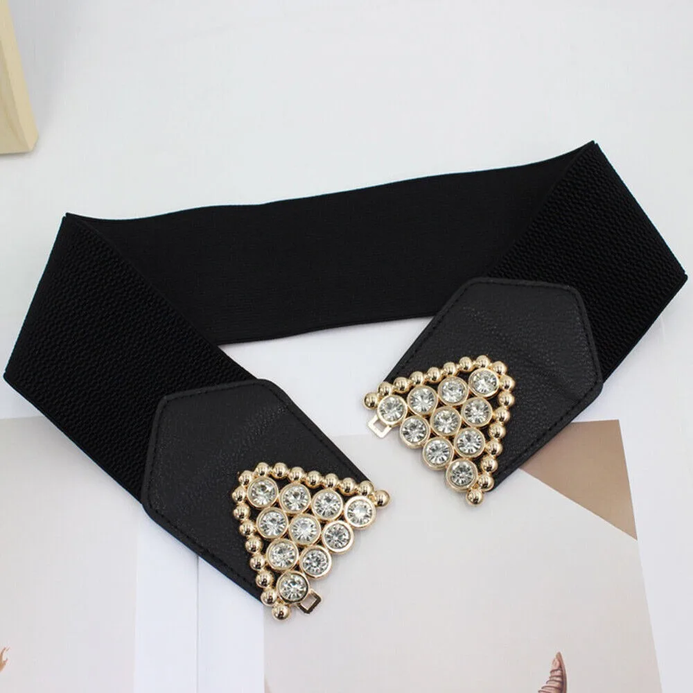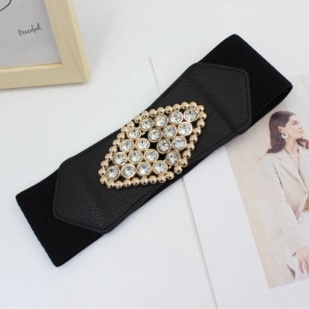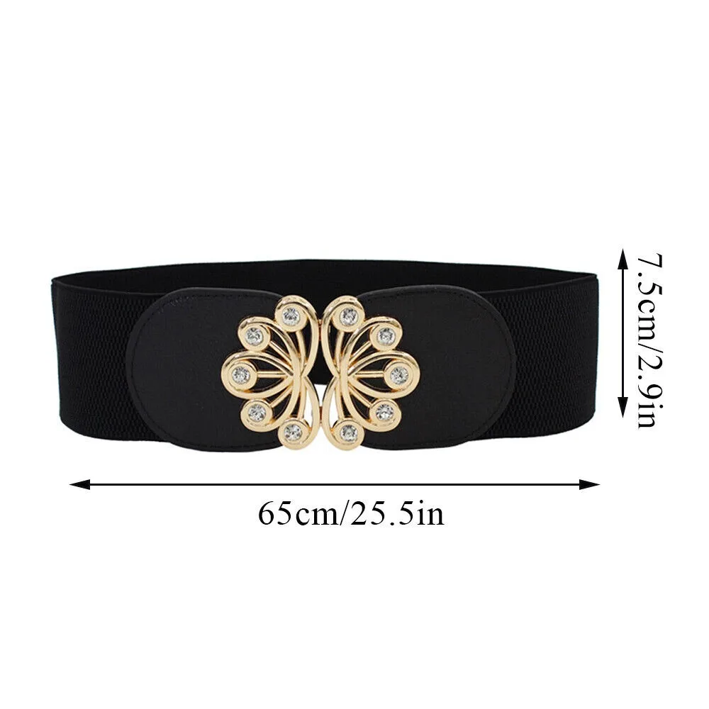 This big-size black stretch corset waistband features a rhinestone metal buckle for a glamorous touch. Designed to shape and define the waist comfortably, it adds instant elegance to dresses, shirts, and outerwear.