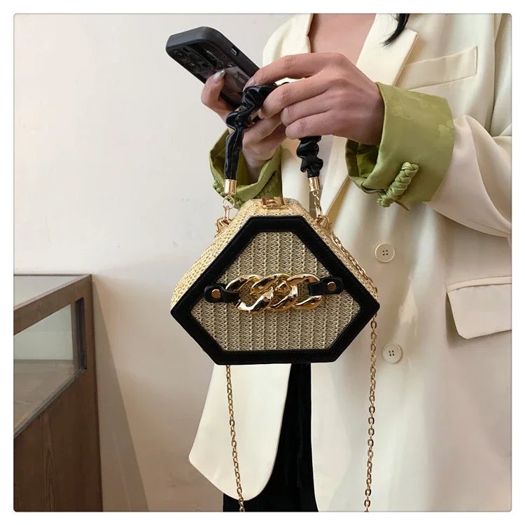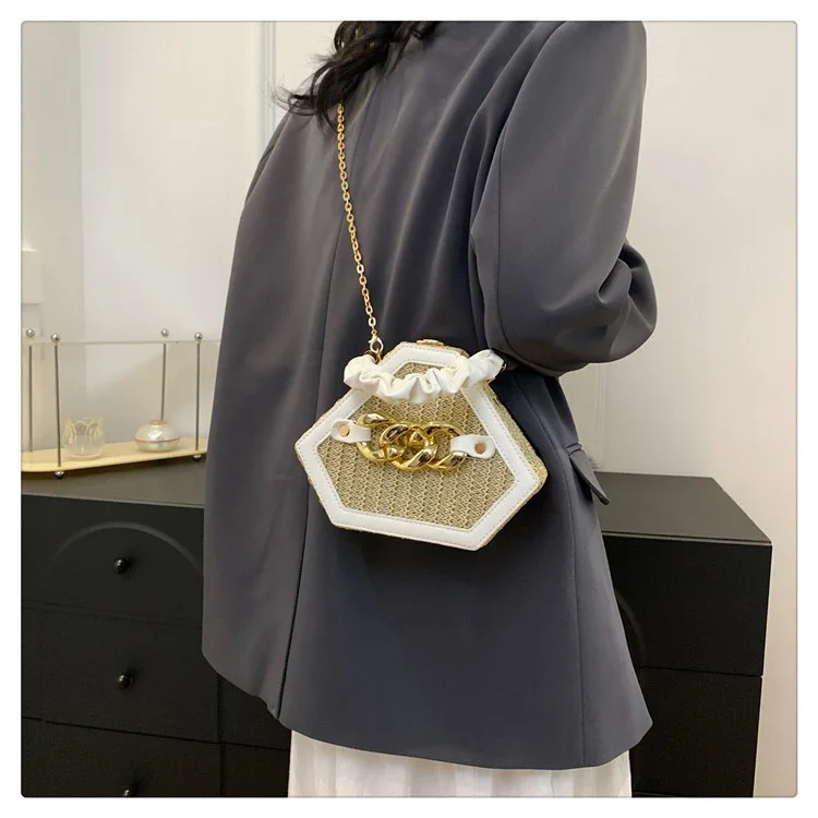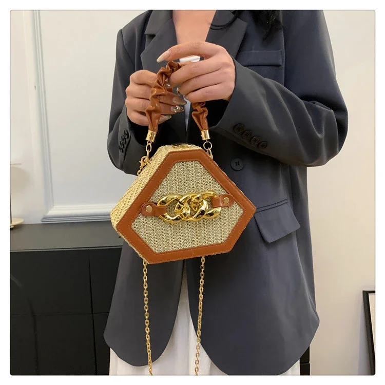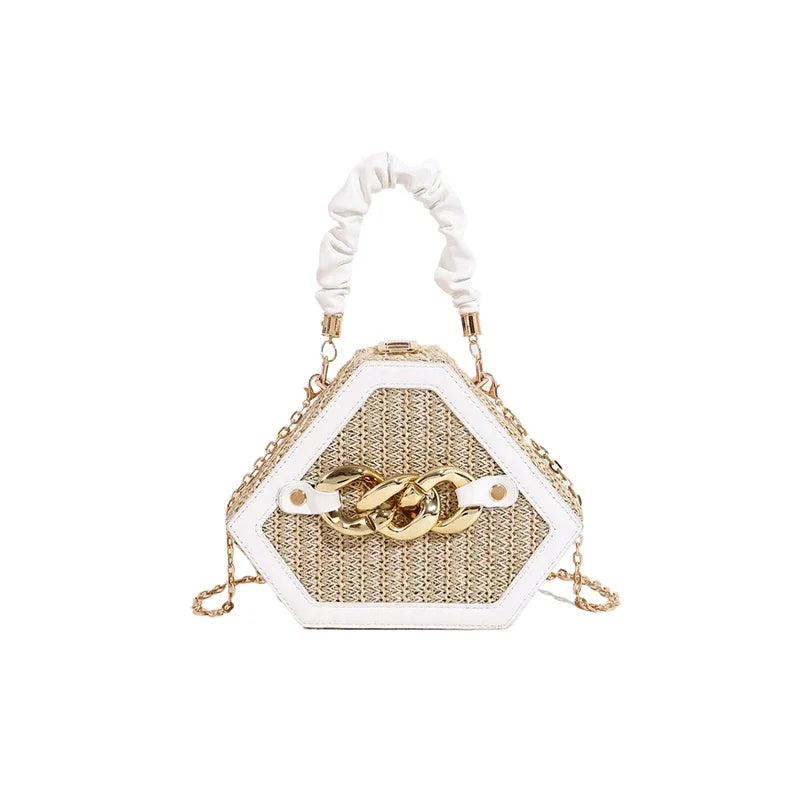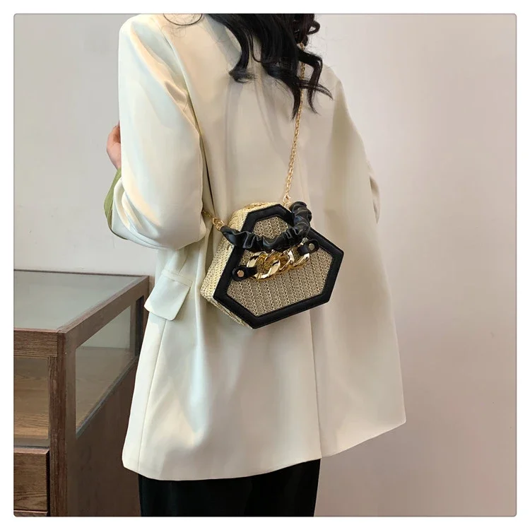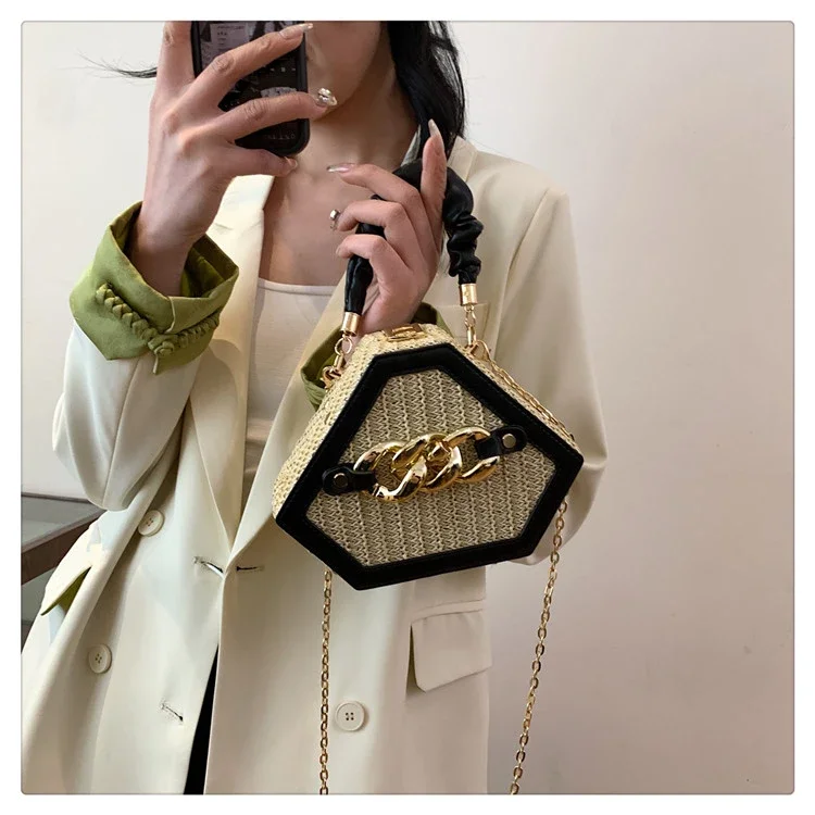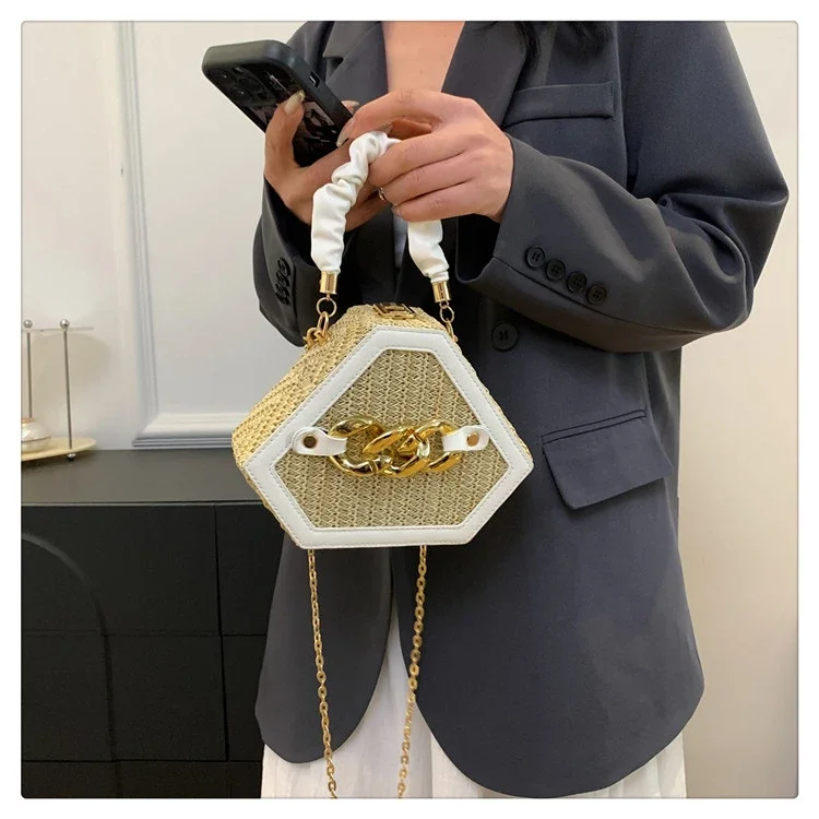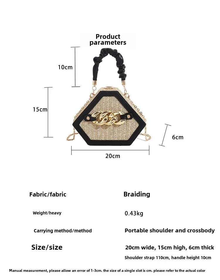 This high-quality straw braid bag features elegant chain details and a versatile shoulder/crossbody design. Lightweight yet refined, it brings a touch of luxury to summer outfits—perfect for vacations, city strolls, or casual chic looks.