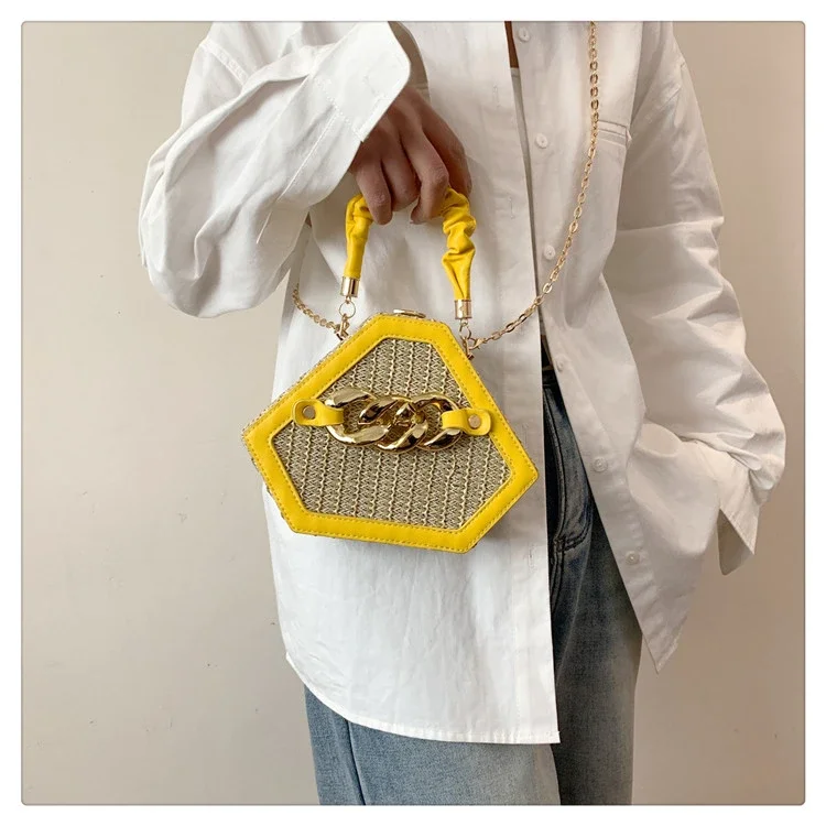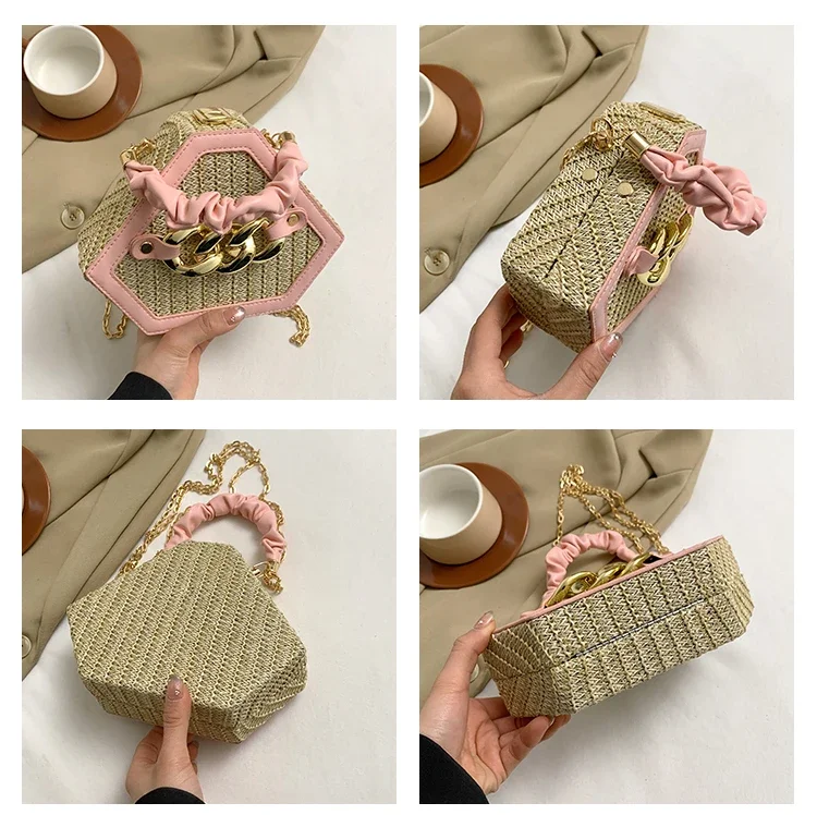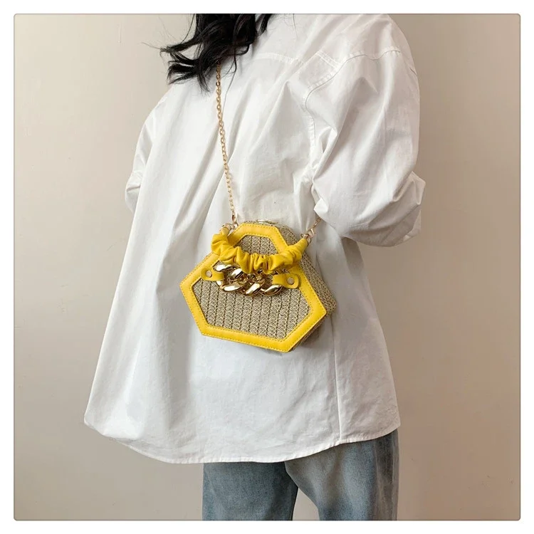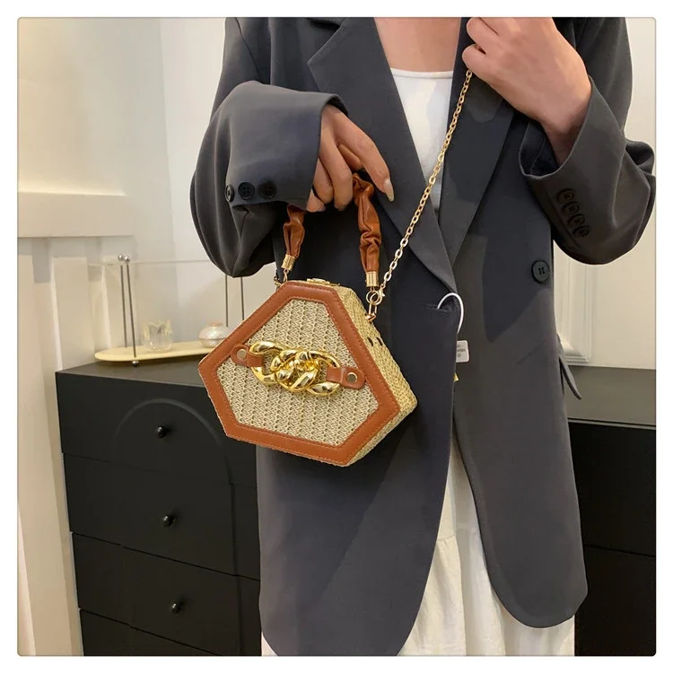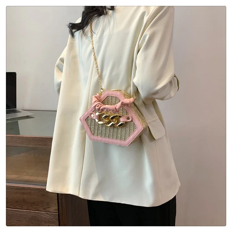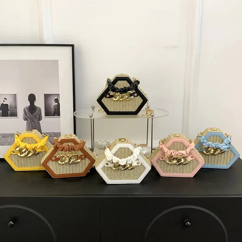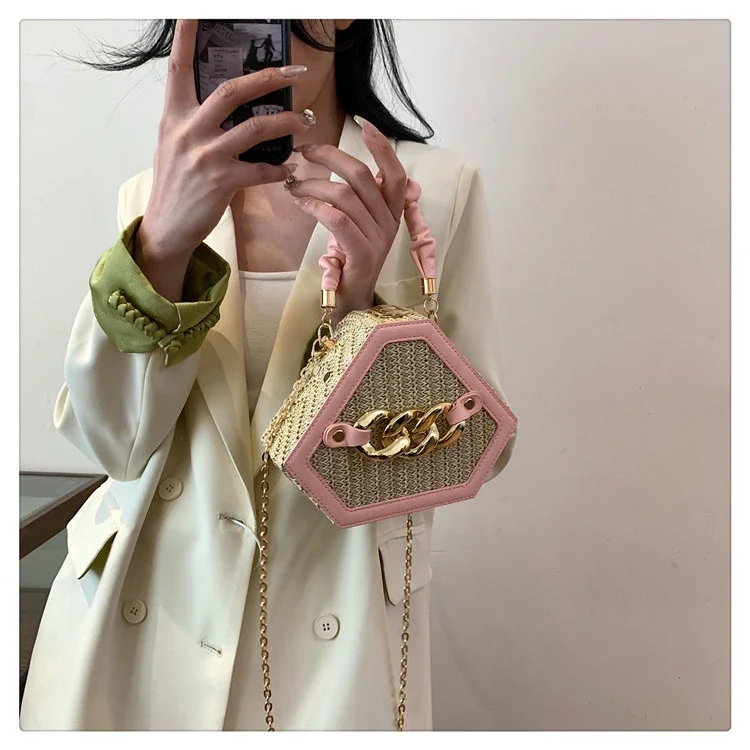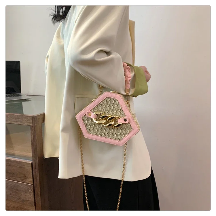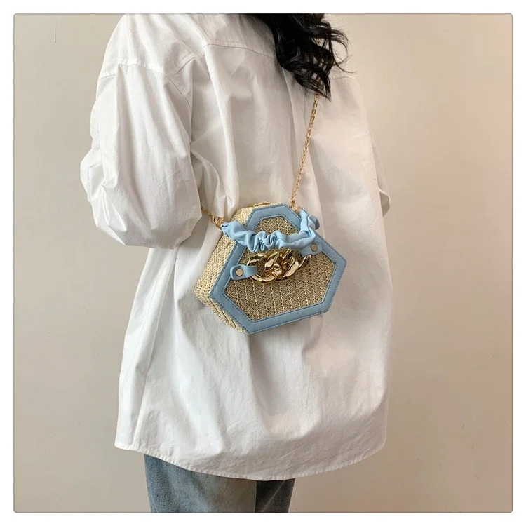This high-quality straw braid bag features elegant chain details and a versatile shoulder/crossbody design. Lightweight yet refined, it brings a touch of luxury to summer outfits—perfect for vacations, city strolls, or casual chic looks.