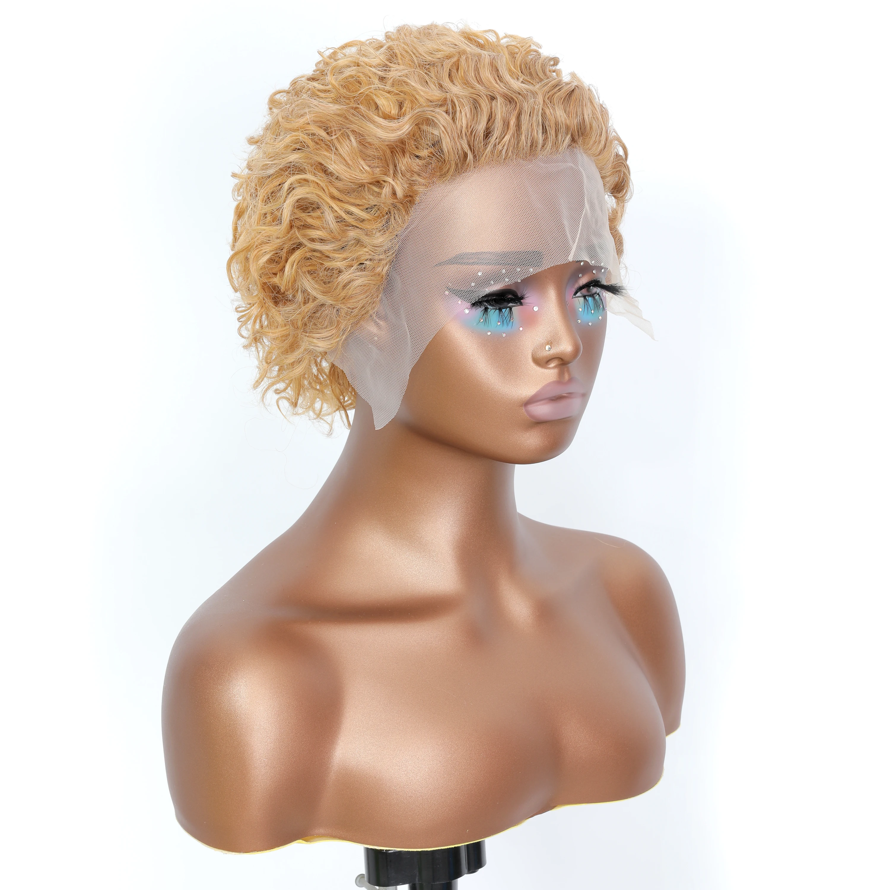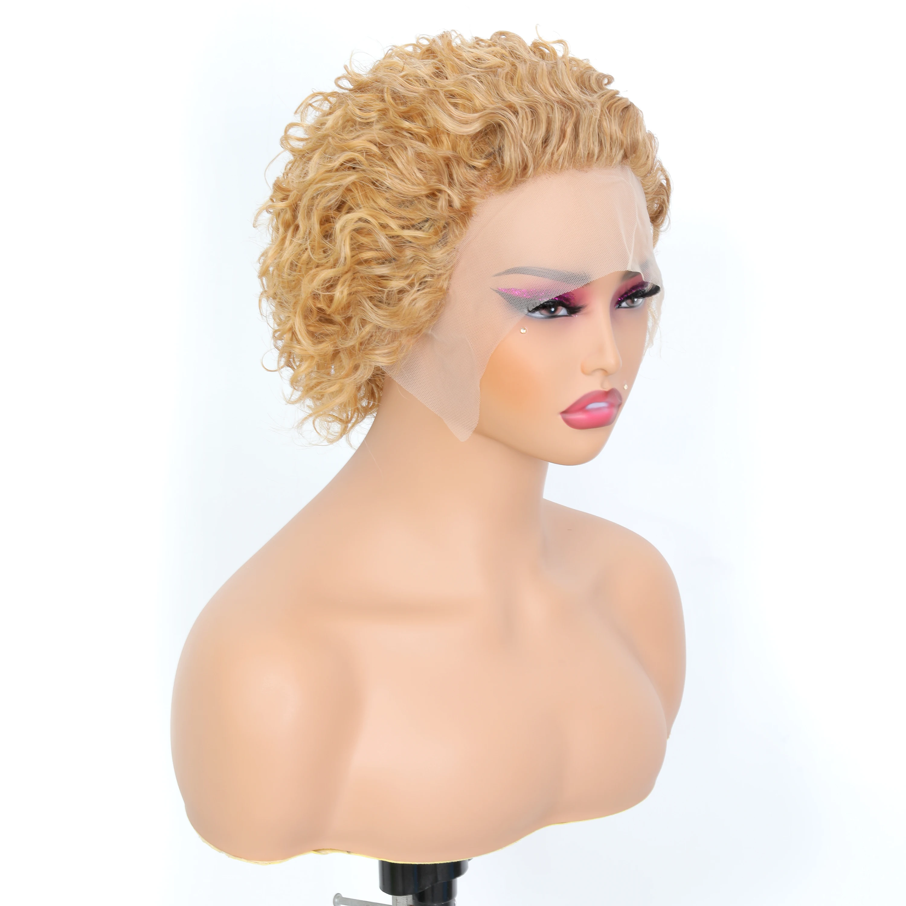 This Honey Blonde #27 pixie cut wig features soft Brazilian curly waves and a 13x1 transparent lace front for a natural hairline and seamless blend. Lightweight, stylish, and easy to wear — perfect for adding a bold, sun-kissed look to your everyday or party style.