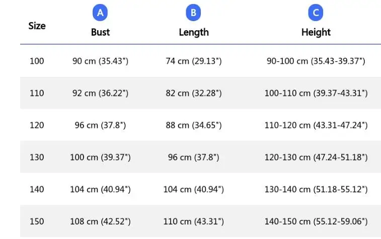 Size 150: Bust 108 cm (42.52''), Length 110 cm (43.31''), Height 140-150 cm (55.12-59.06'')