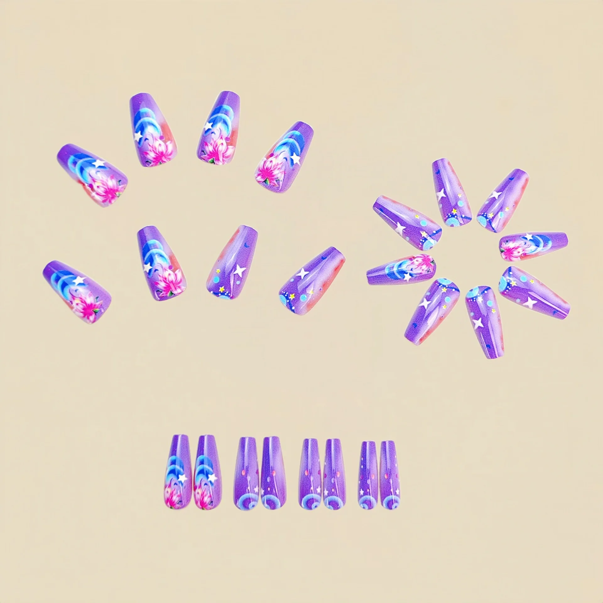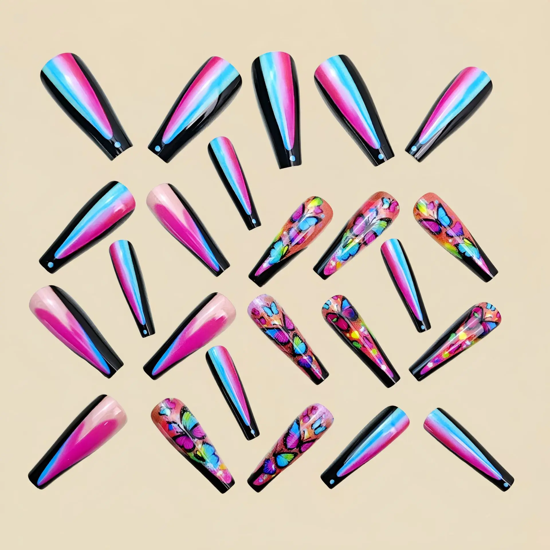 Upgrade your nail look in seconds with these press-on false nails featuring a dreamy gradient of purple, pink, and floral butterfly details. Inspired by Y2K style, they come in square tips with short to medium length — perfect for summer vibes, parties, or everyday glam.