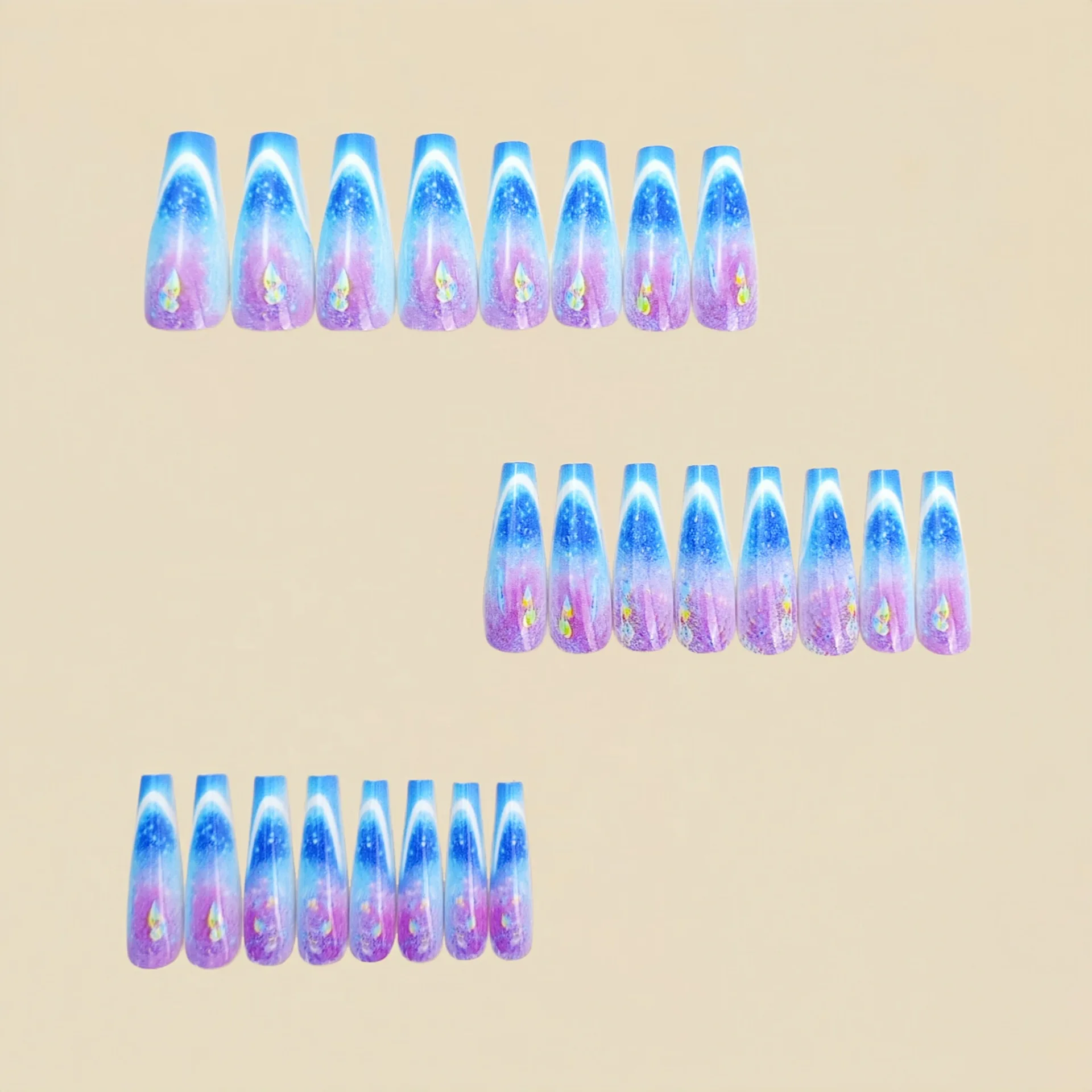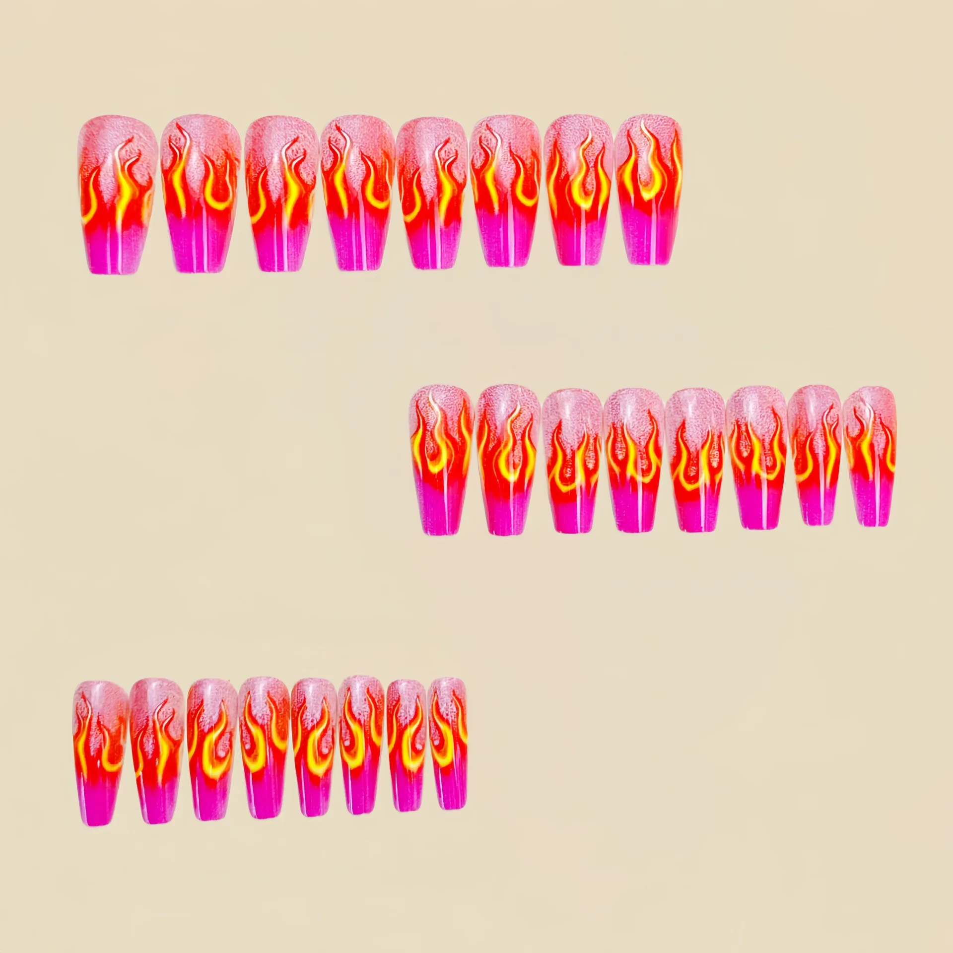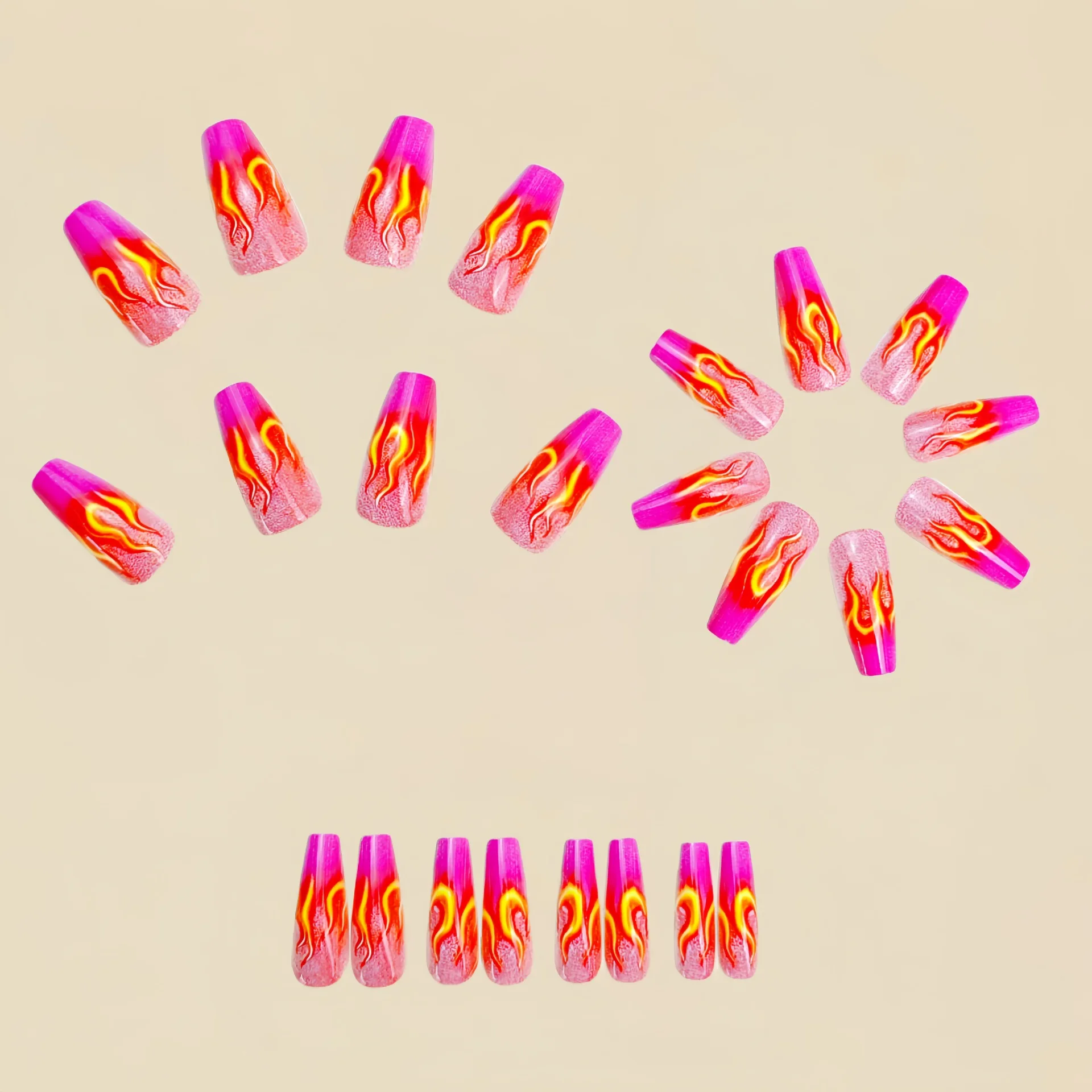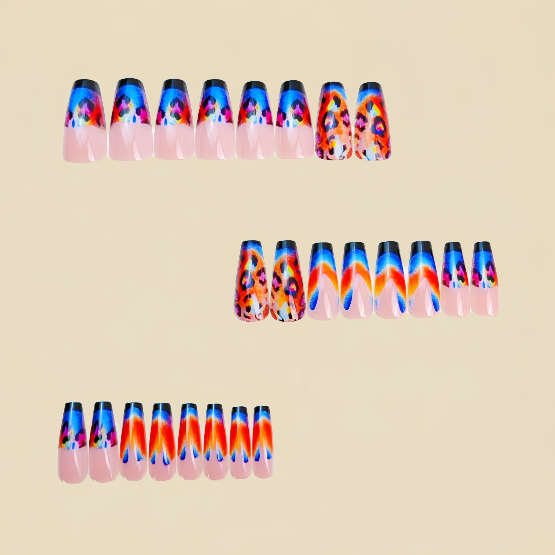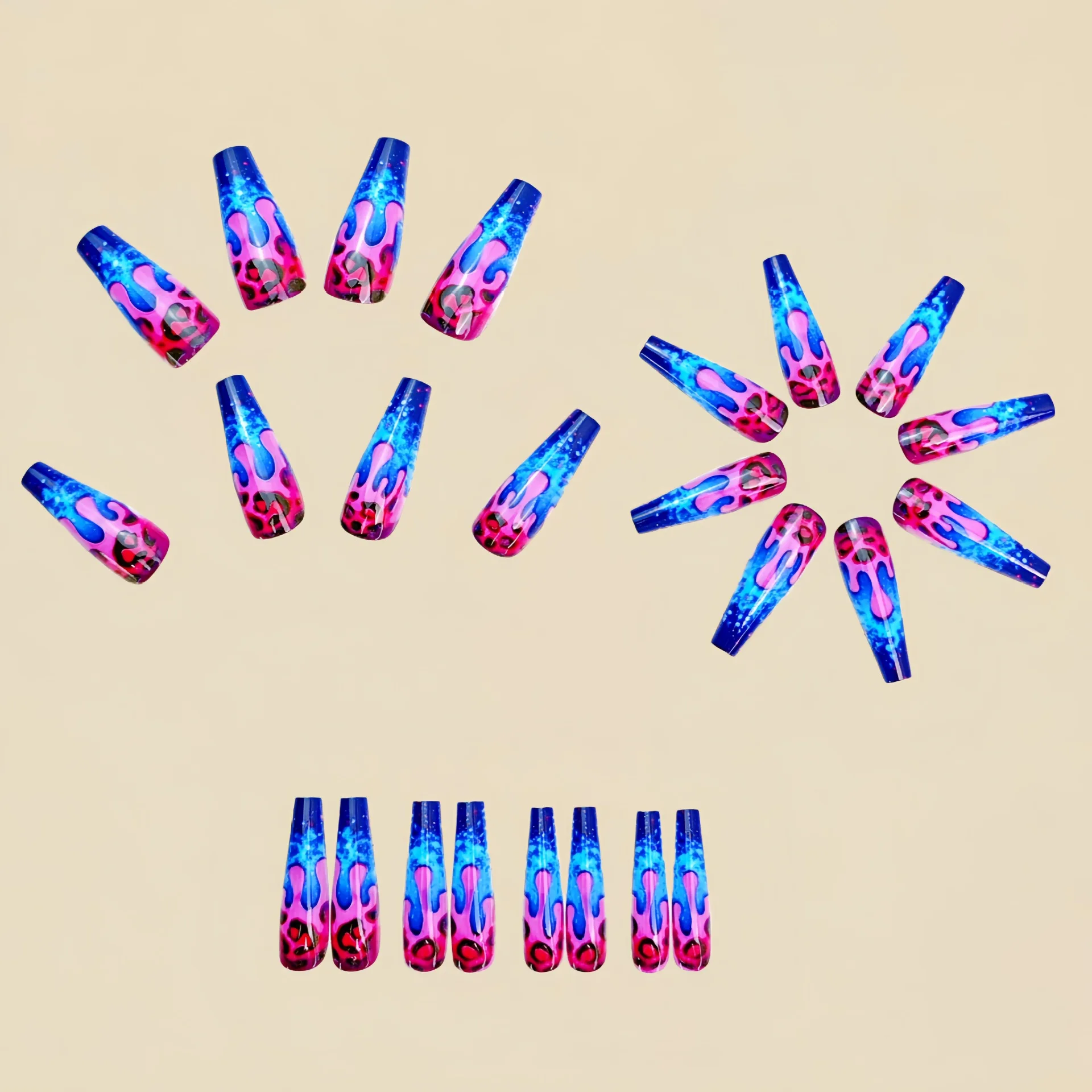 This press-on nail set features short-to-medium long square/ballet tips with a vibrant Y2K design—gradient purple, pink, and blue mixed with leopard and flame accents. Easy to apply and comfortable to wear, it delivers standout nail art in minutes.