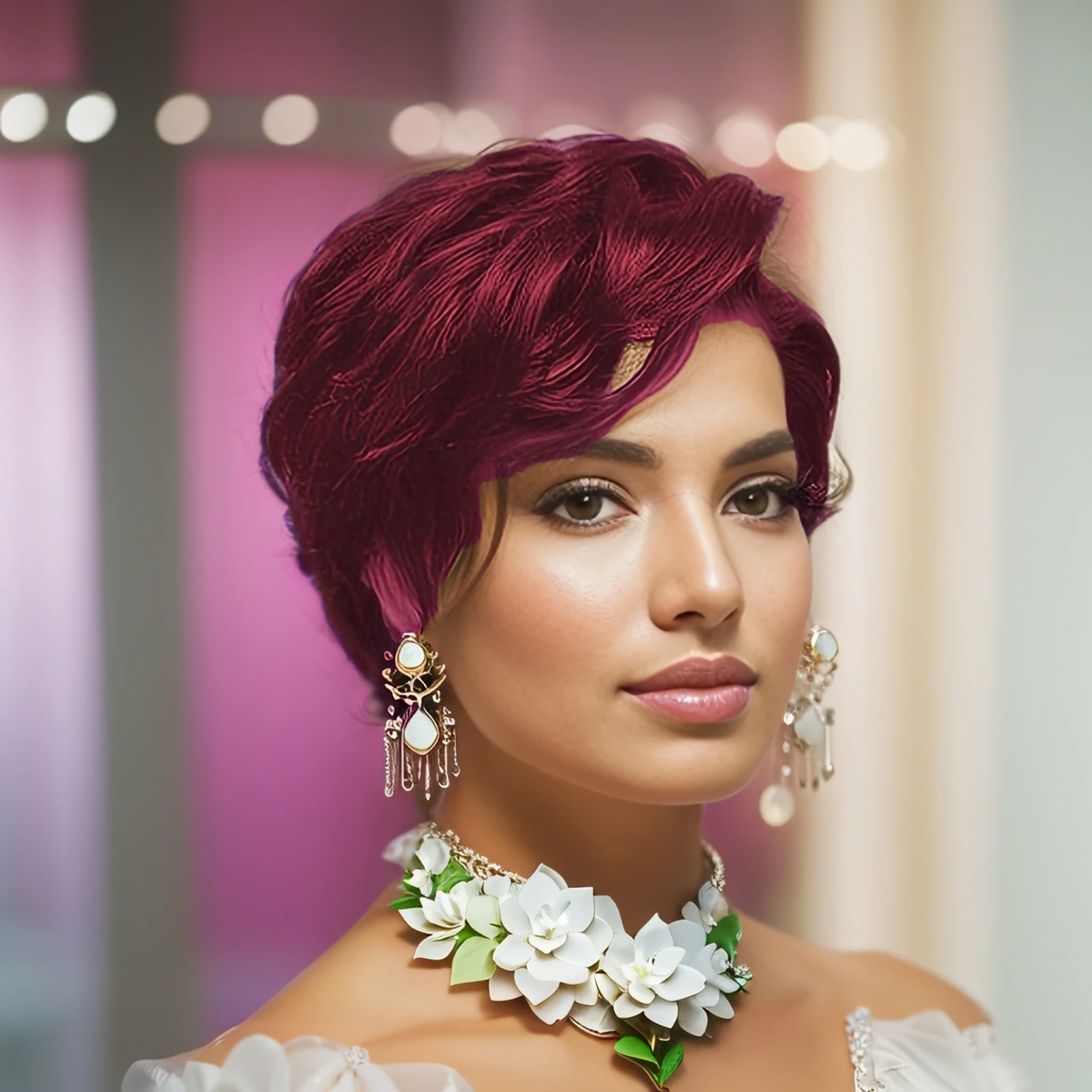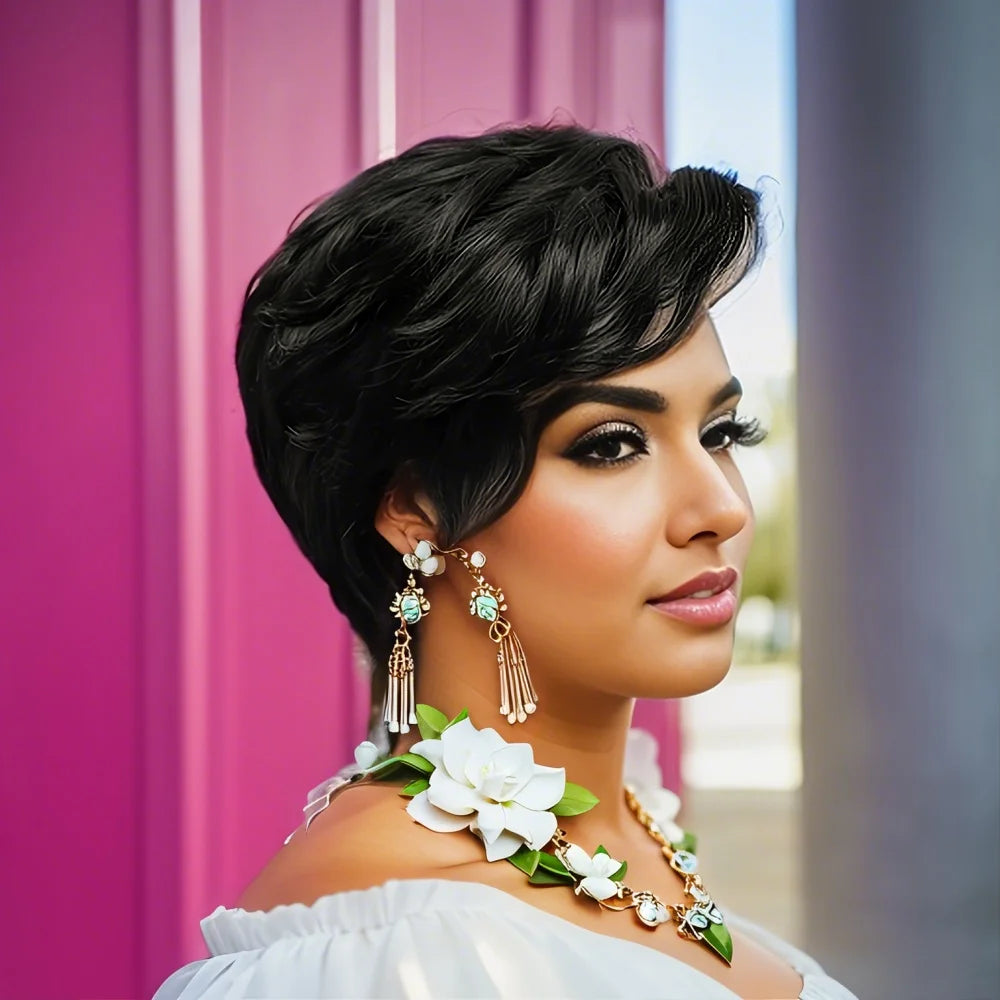 Enhance your look with this 13x4 Lace Front Pixie Cut Human Hair Wig, designed with soft curly waves and a natural, pre-plucked hairline for a flawless finish.