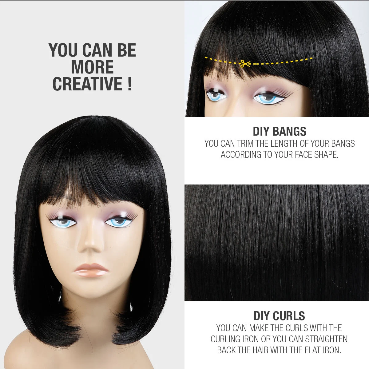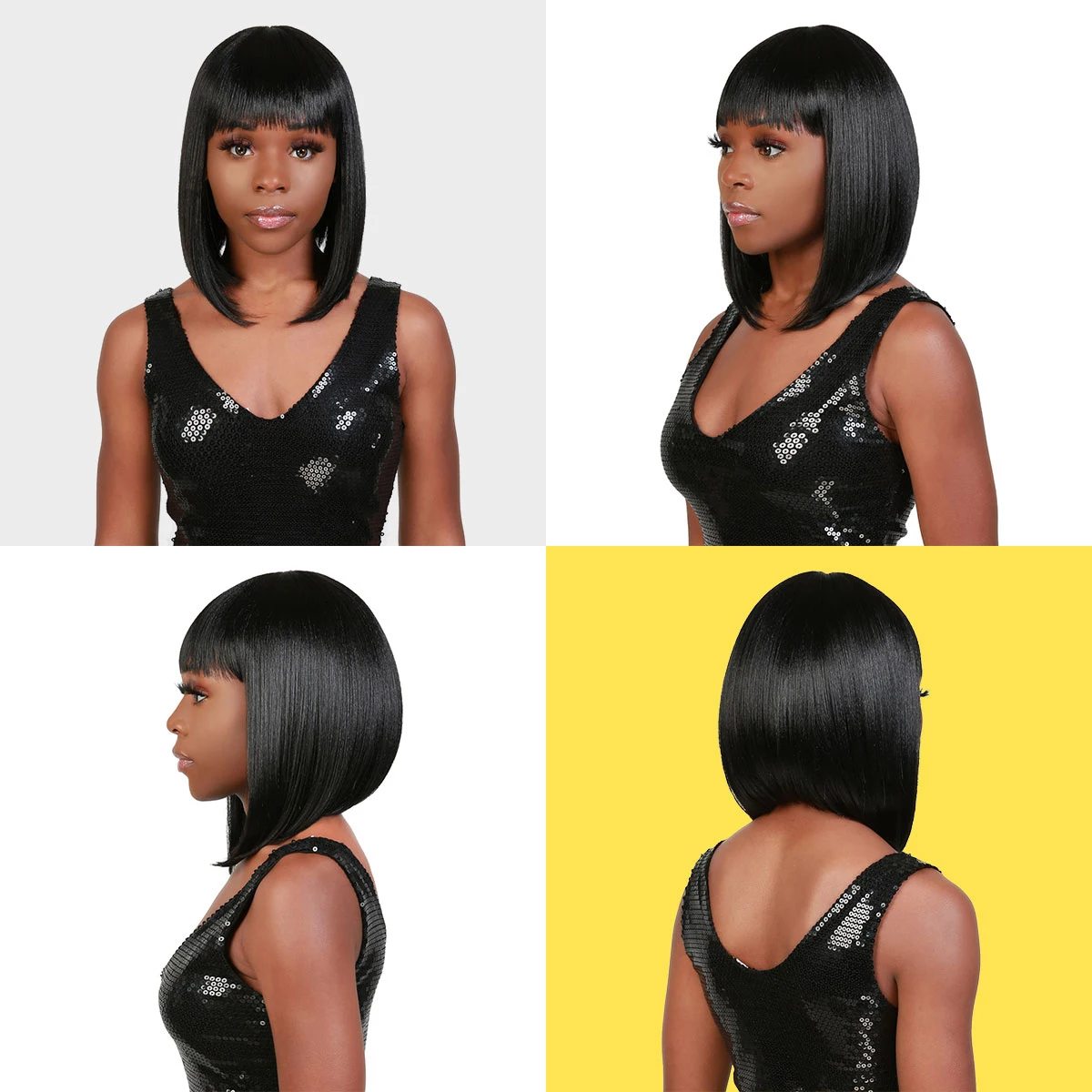 This synthetic straight bob wig with bangs offers a smooth texture and a trendy, polished look. Lightweight and comfortable, it’s easy to wear and perfect for everyday styling.