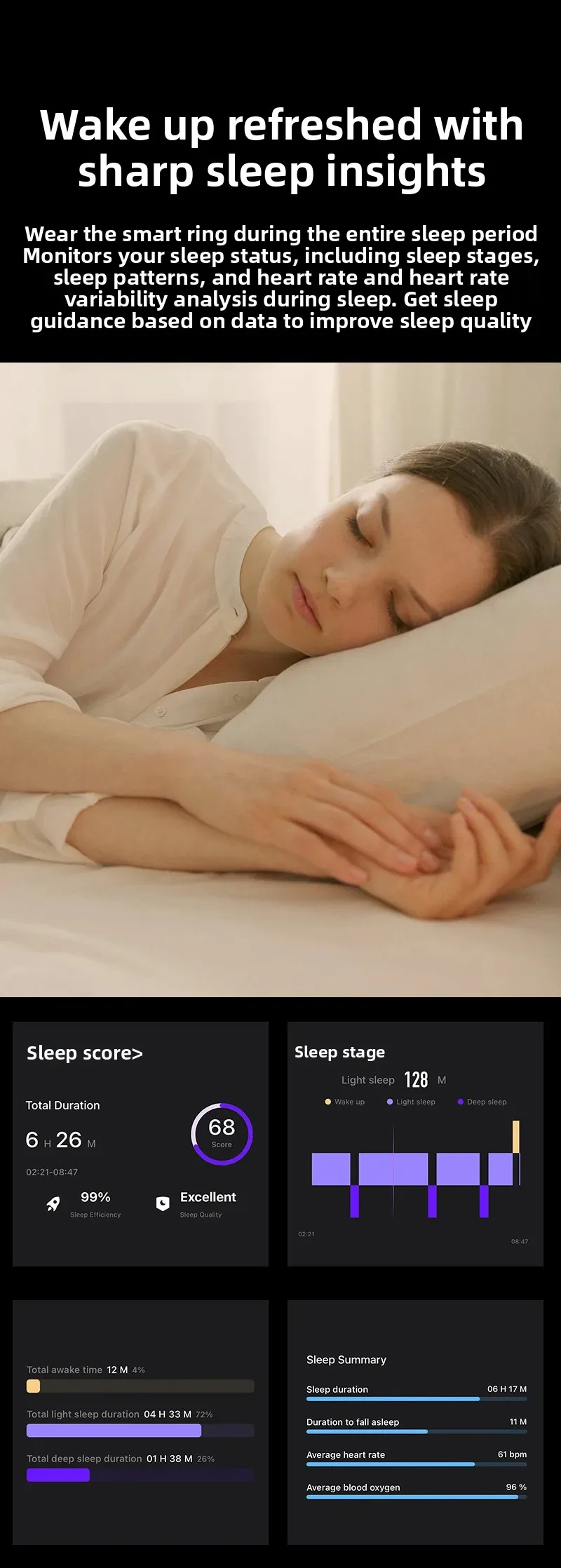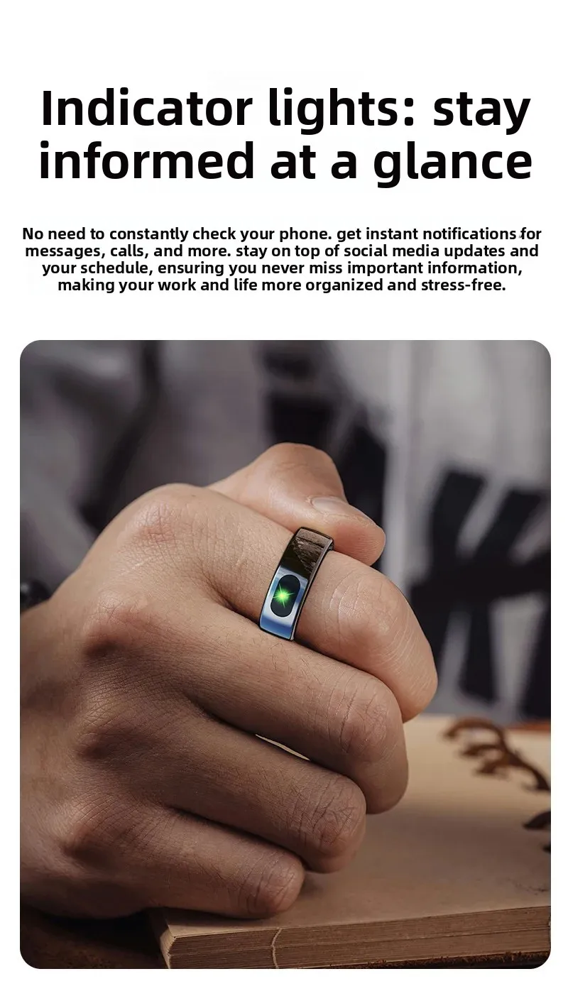 • Multi-Functionality : This smart ring is not just a fashion accessory but also a functional device that can control music, manage photos, and monitor your sleep and heart rate.