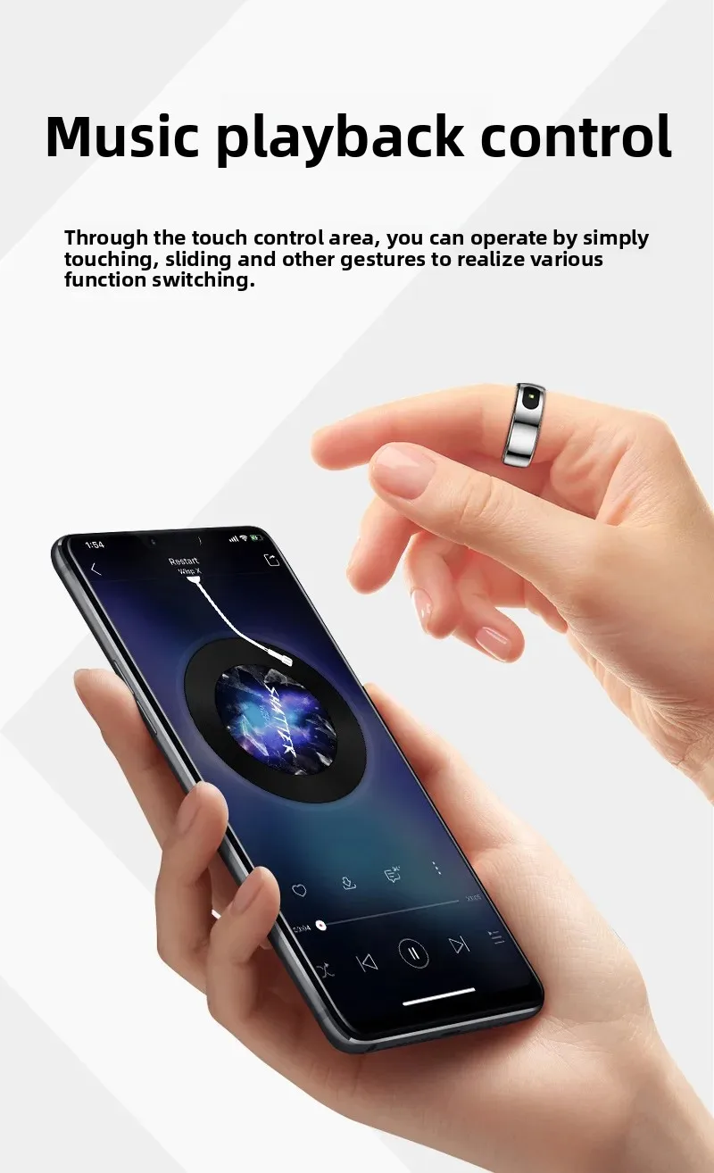 This waterproof smart ring features touch control and advanced health tracking, including sleep monitoring, heart rate, and blood oxygen levels. Control your music easily while staying connected to your fitness and wellness data — all in a compact, modern design.
